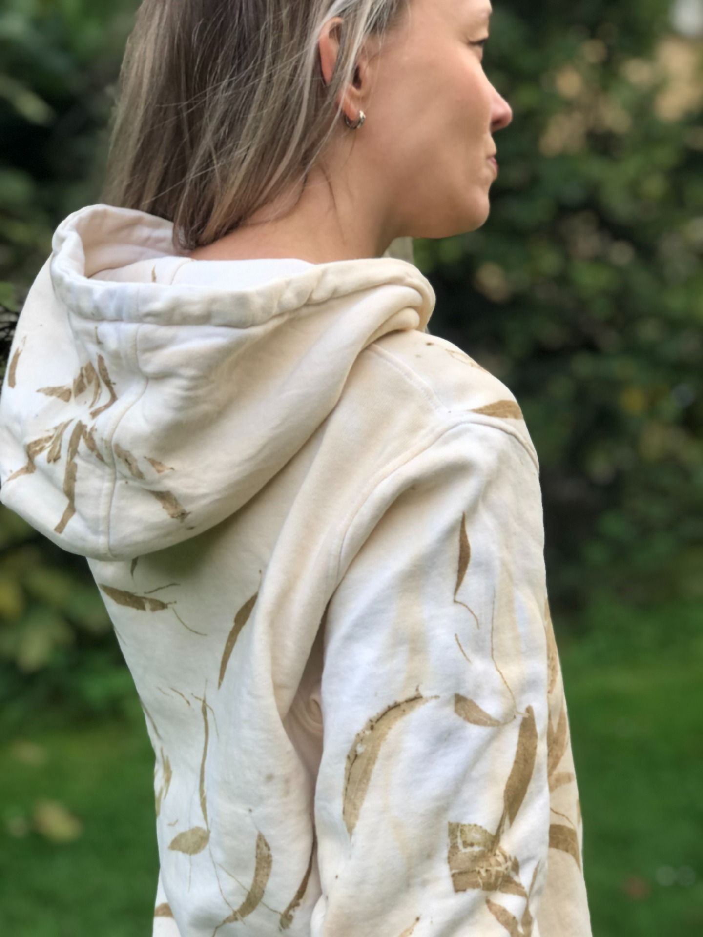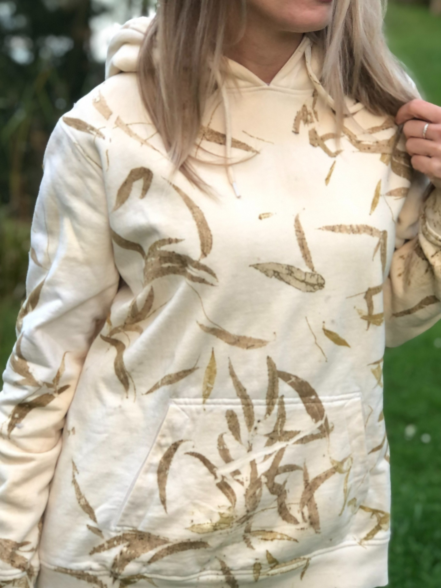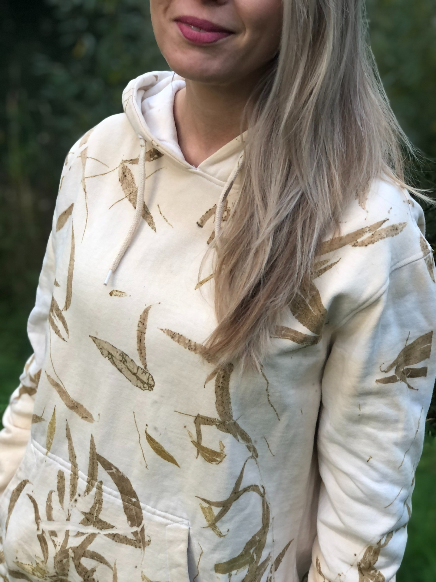 Mikinu sama nešiji, ale pečlivě vybírám kvalitní kousky, které splňují vysoké standardy. Poté je ručně potisknu technikou ecoprint, aby každý kus byl originál.