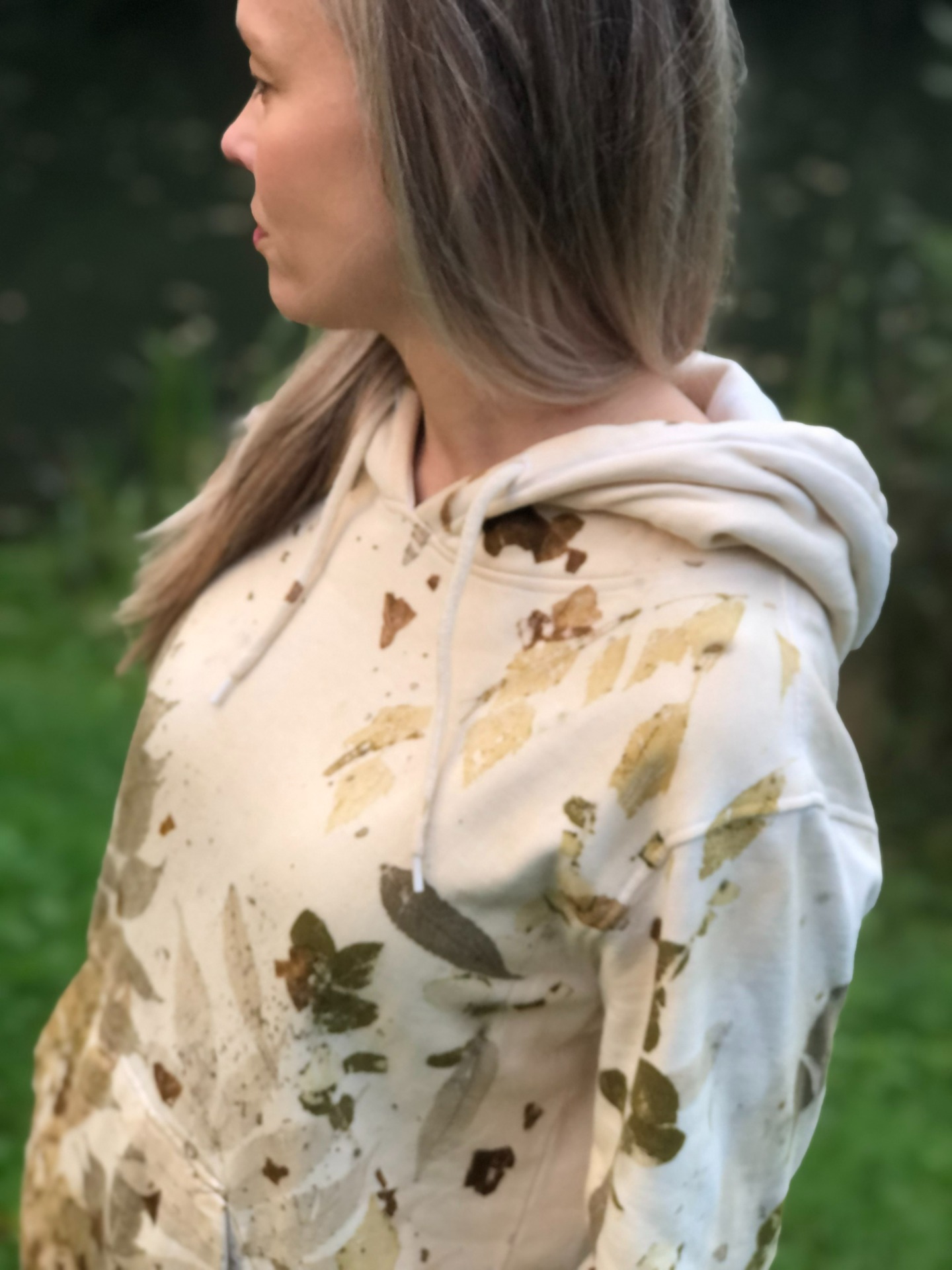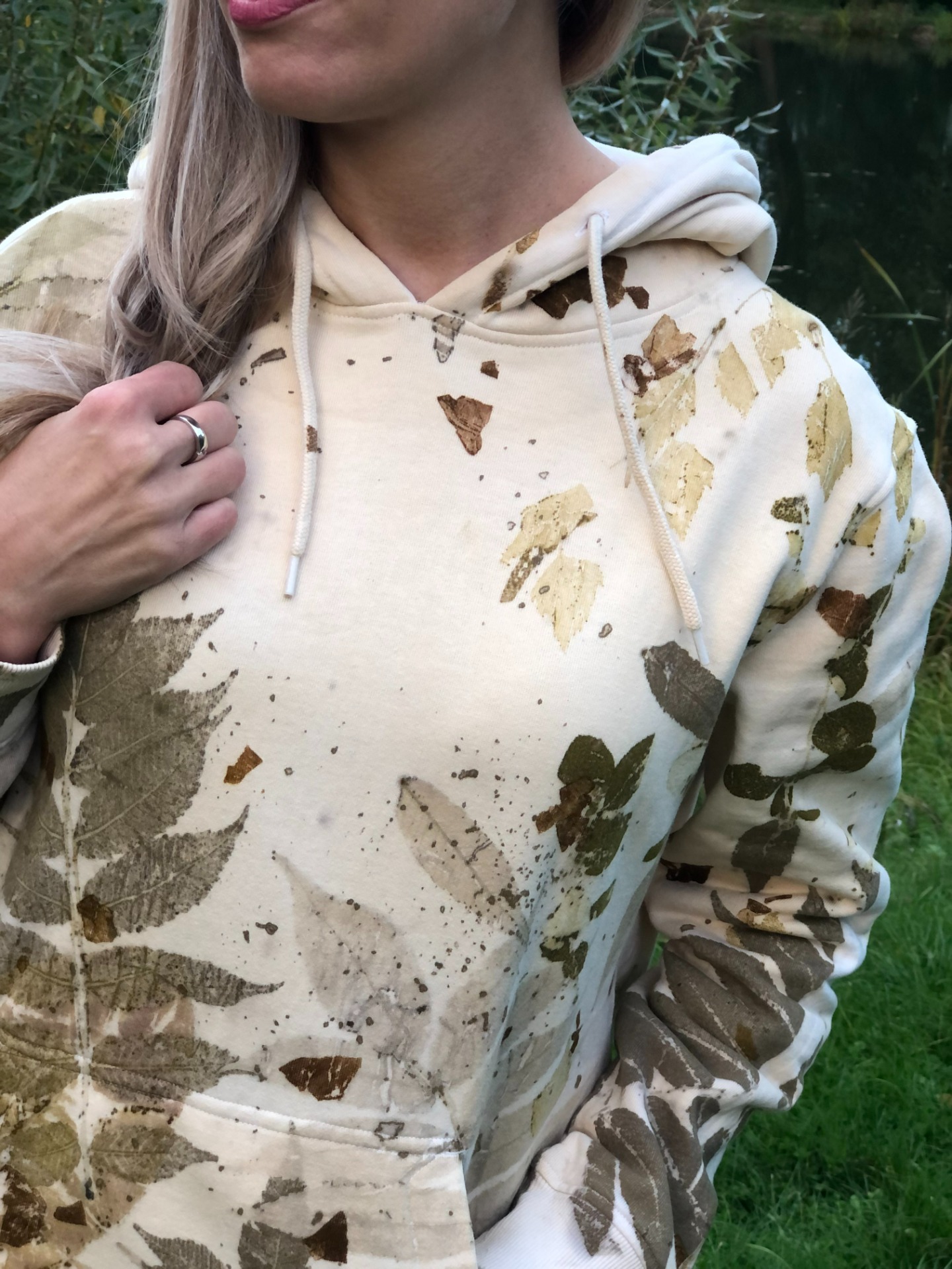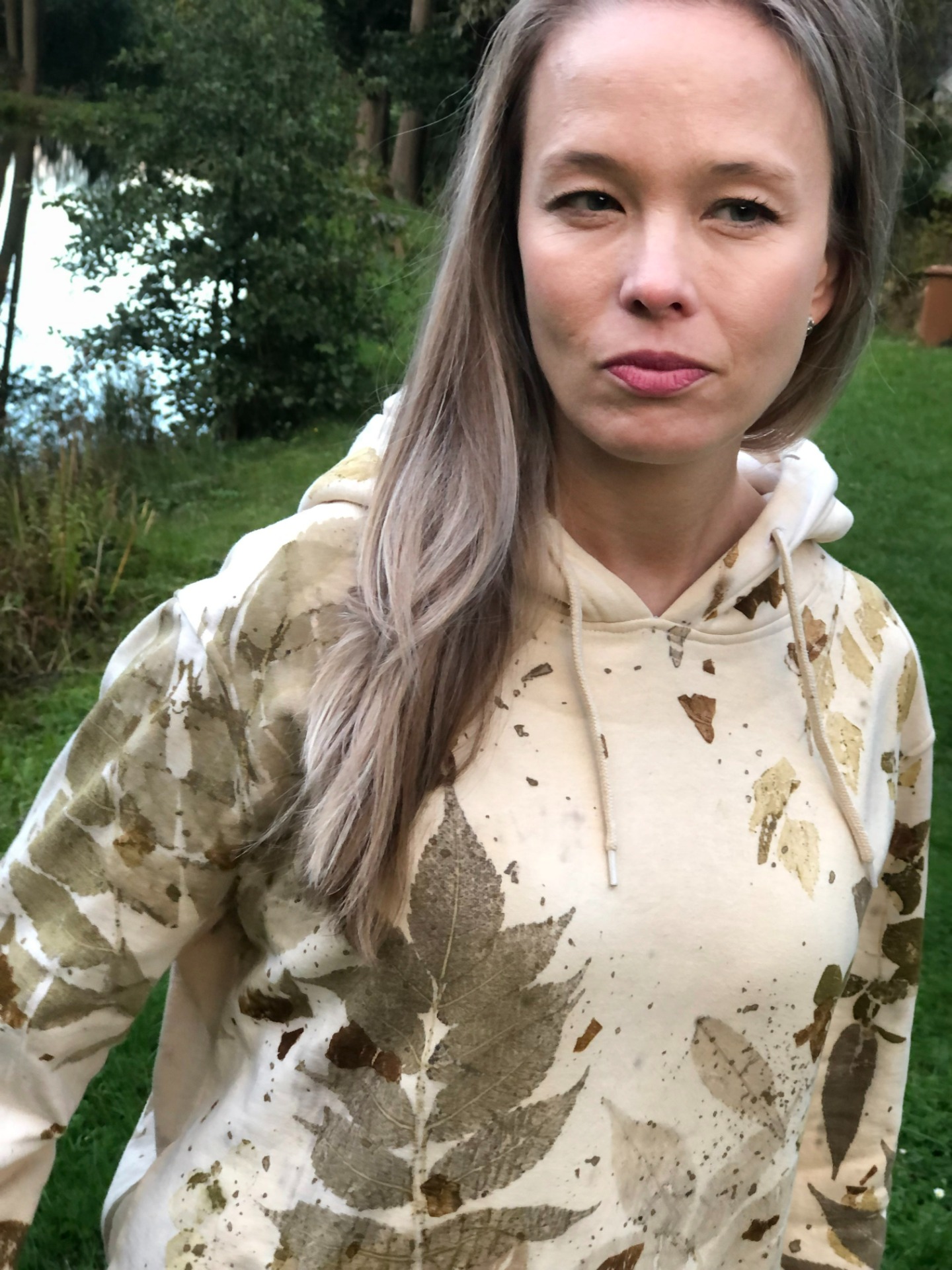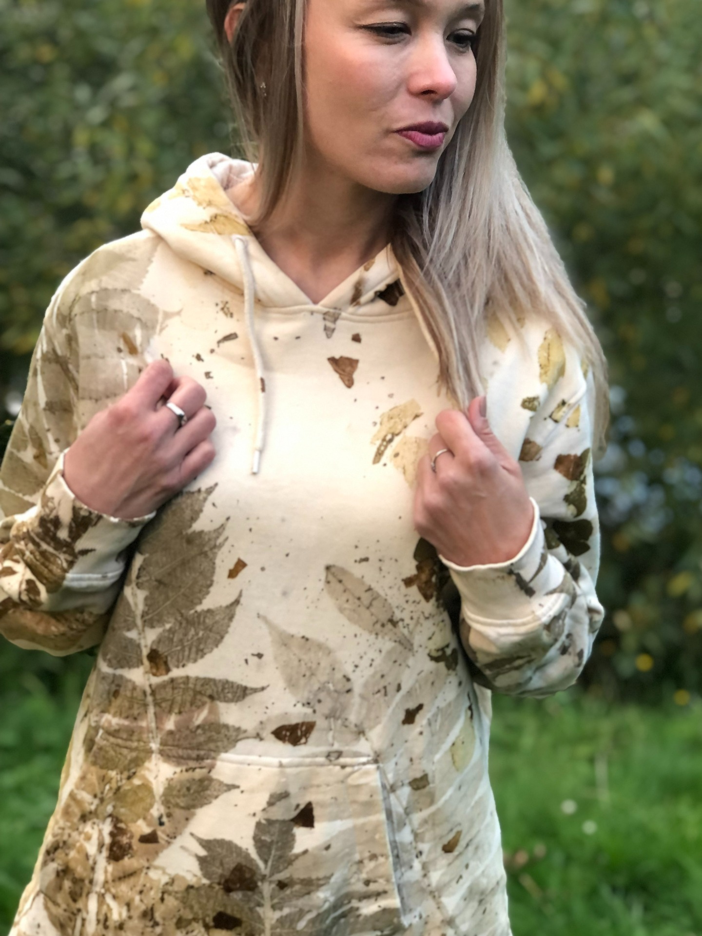 Mikinu sama nešiji, ale pečlivě vybírám kvalitní kousky, které splňují vysoké standardy. Poté je ručně potisknu technikou ecoprint, aby každý kus byl originál.
