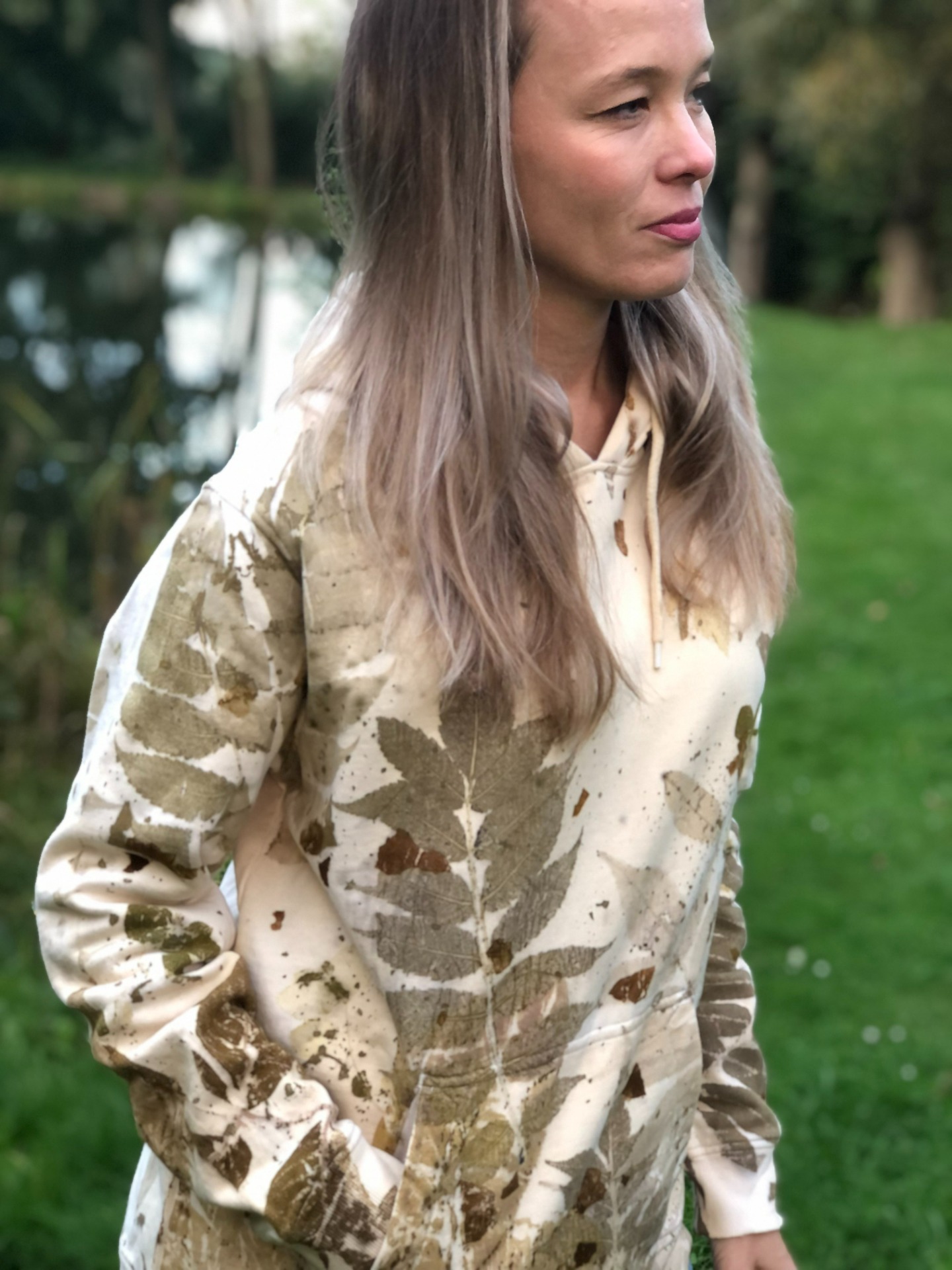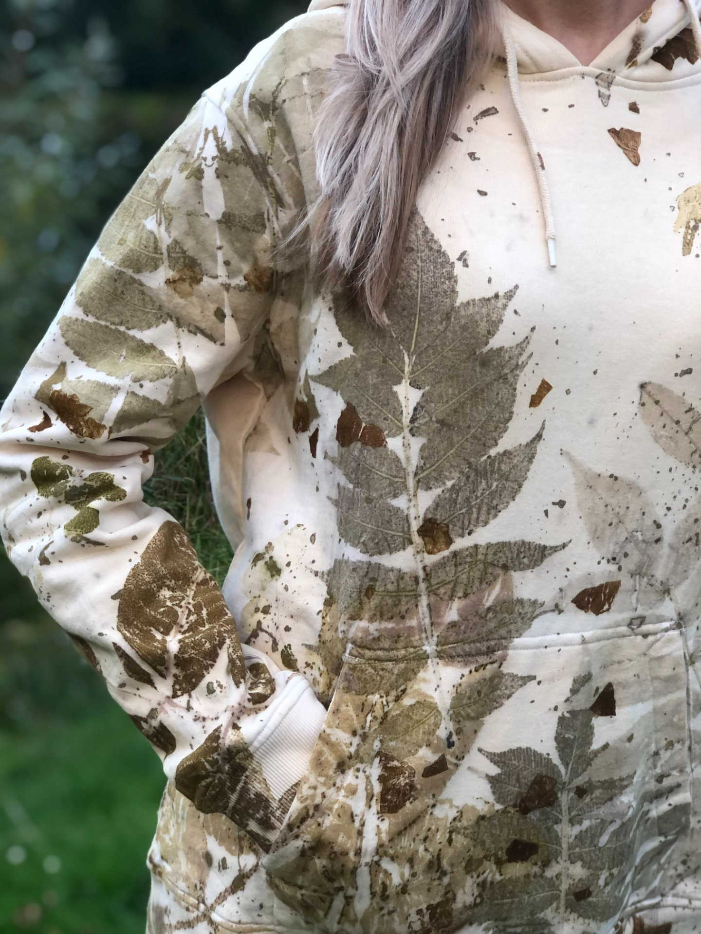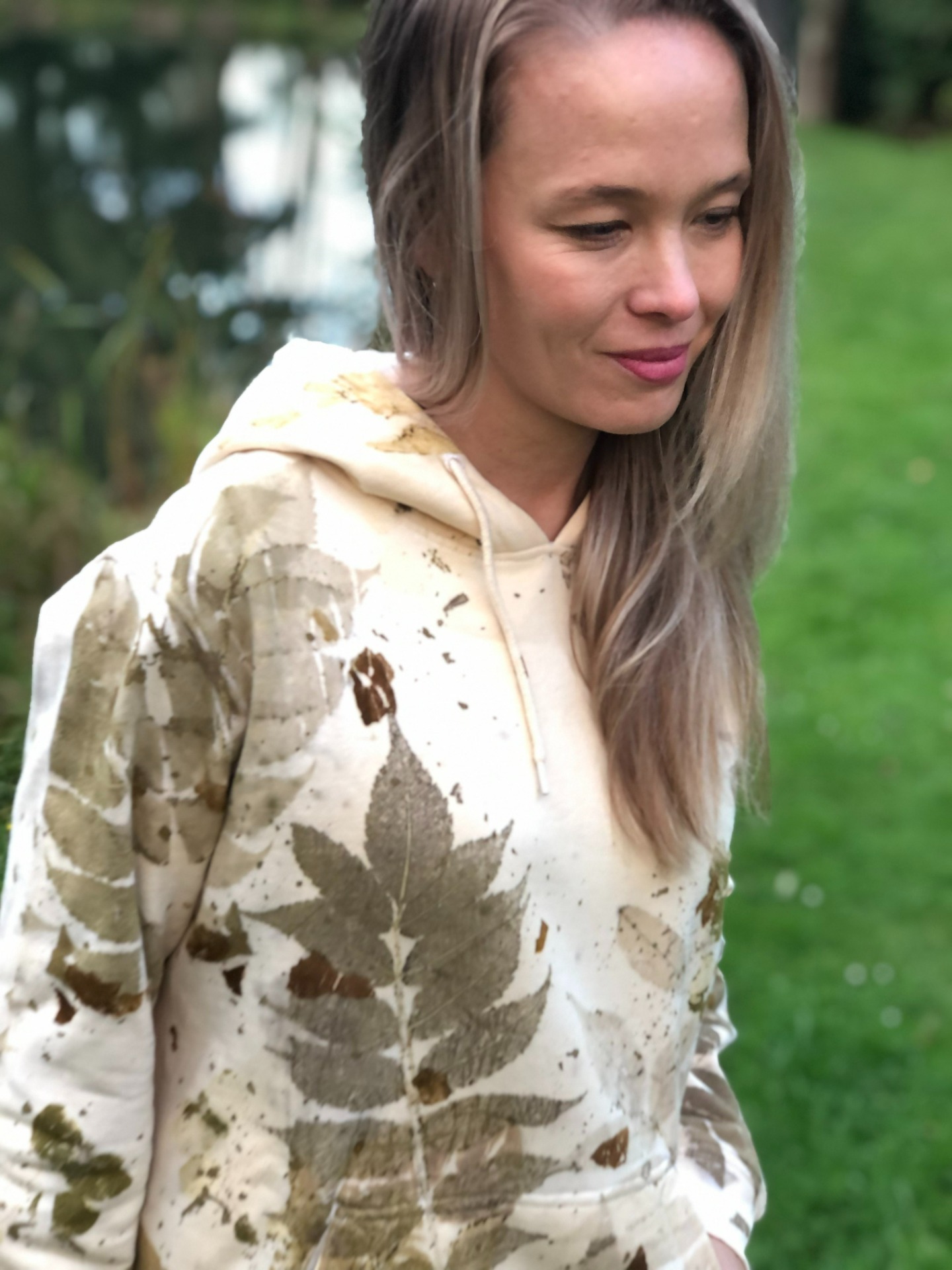 Mikinu sama nešiji, ale pečlivě vybírám kvalitní kousky, které splňují vysoké standardy. Poté je ručně potisknu technikou ecoprint, aby každý kus byl originál.