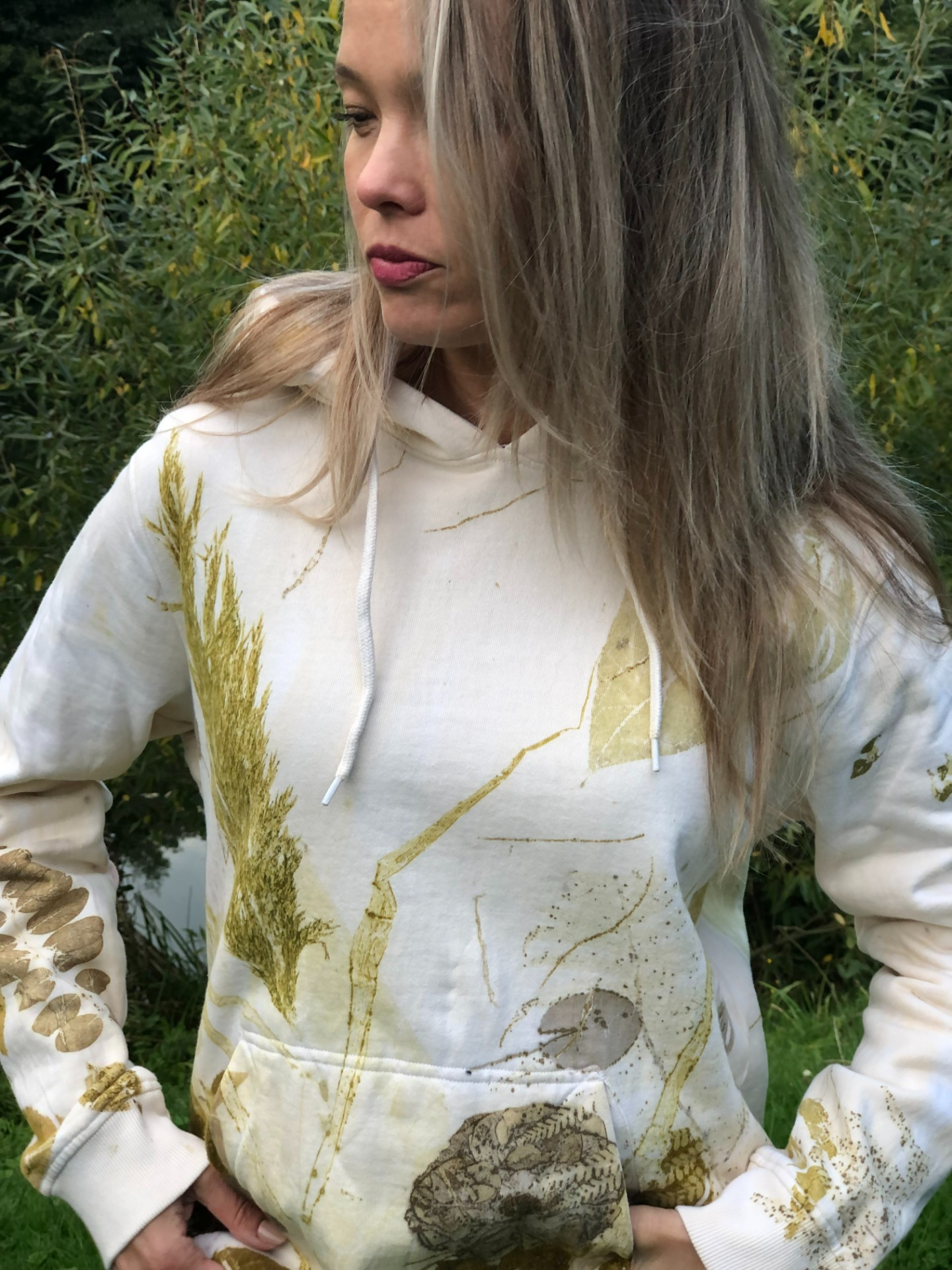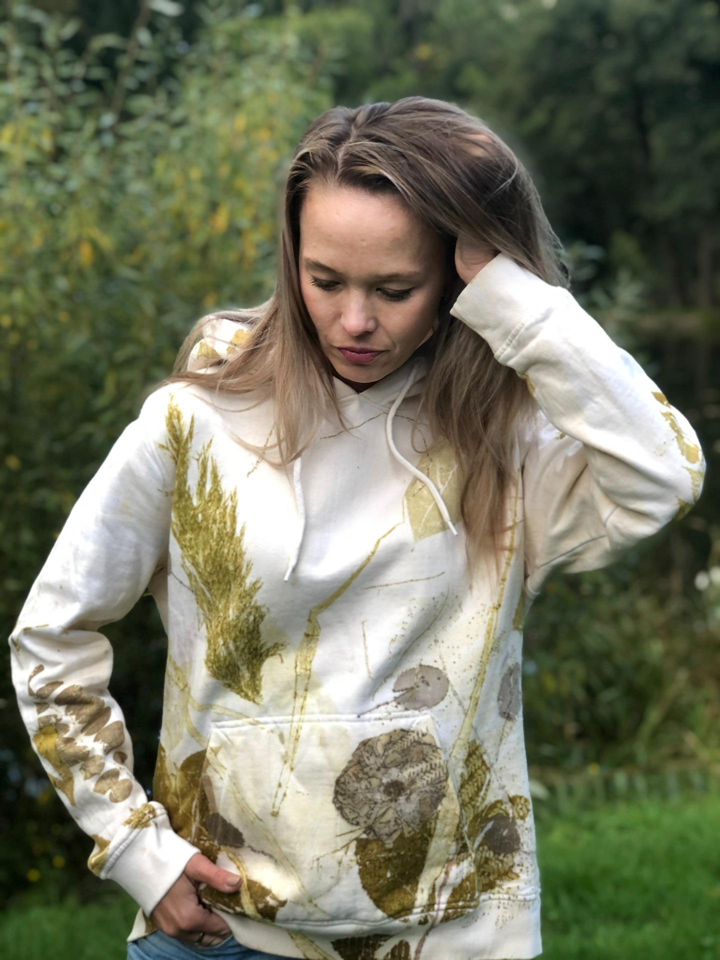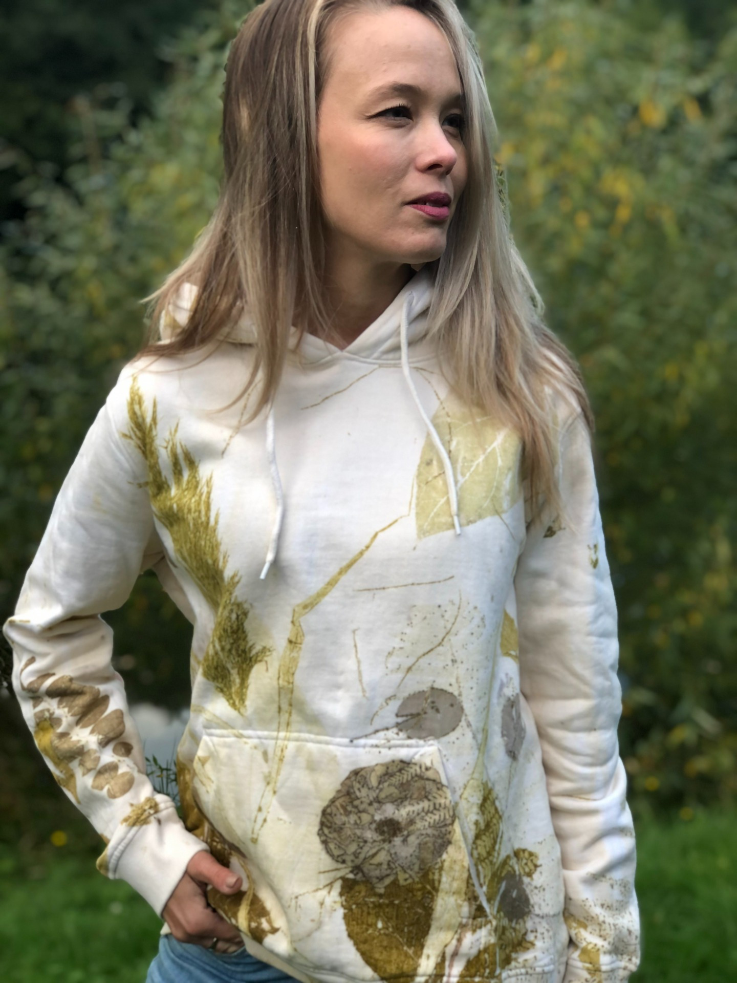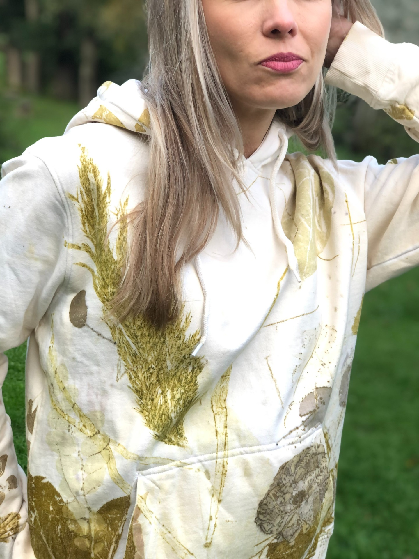 Mikinu sama nešiji, ale pečlivě vybírám kvalitní kousky, které splňují vysoké standardy. Poté je ručně potisknu technikou ecoprint, aby každý kus byl originál.