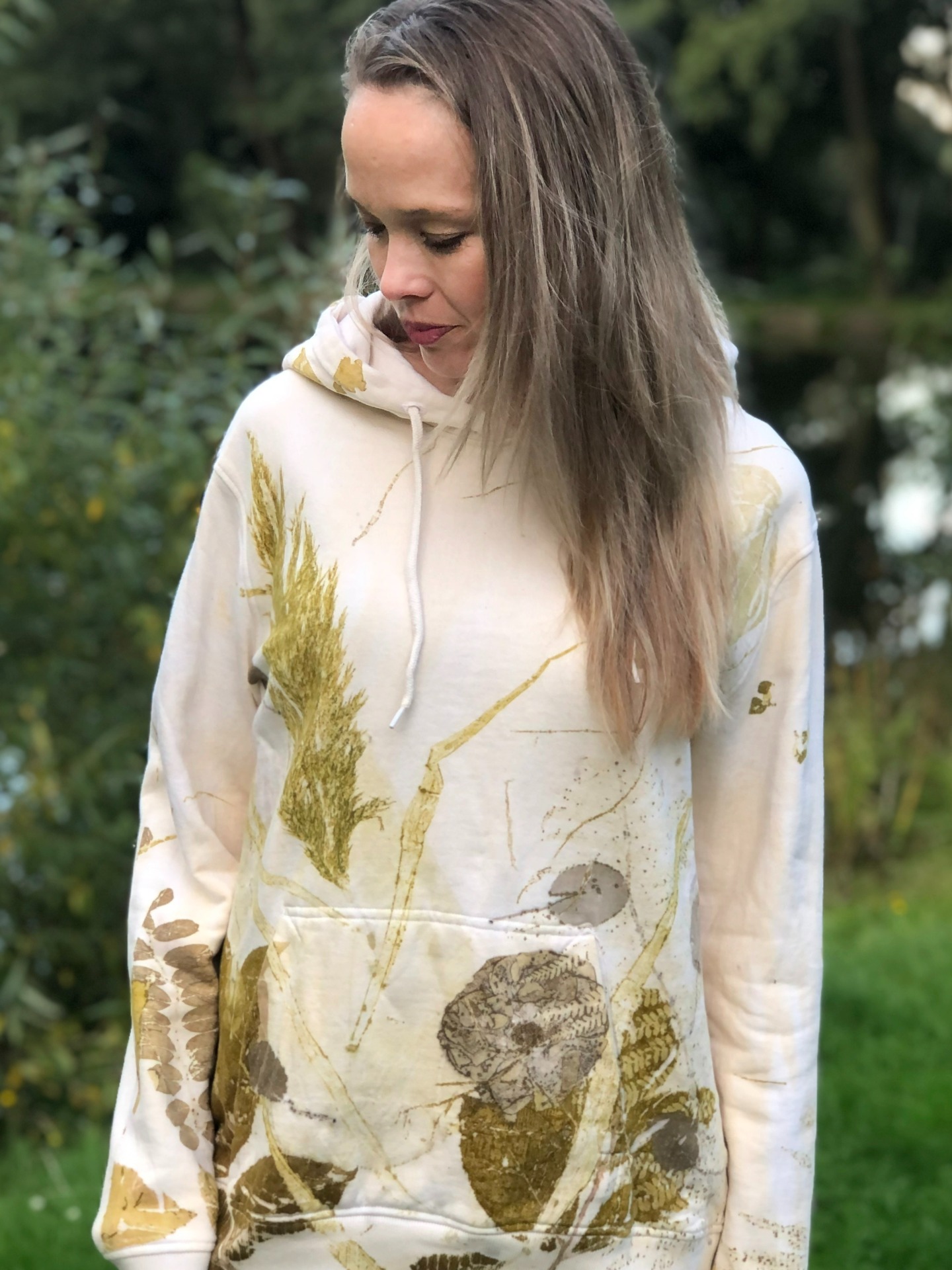 Tahle biobavlněná mikina s přírodním potiskem je zdobená ručním tiskem skutečnými listy a květinami. Technika ecoprint využívá přírodní barviva, takže na látce najdete autentické otisky ořechu, topinamburu a dalších rostlin. Každý kus je jedinečný, stejně jako příroda sama.